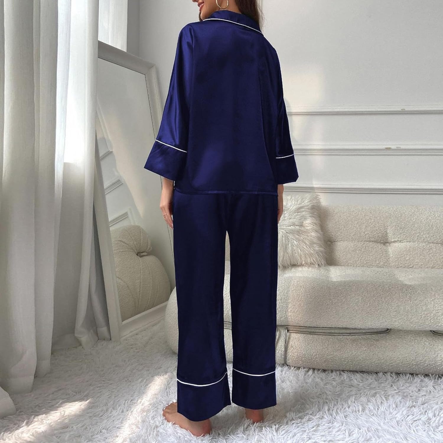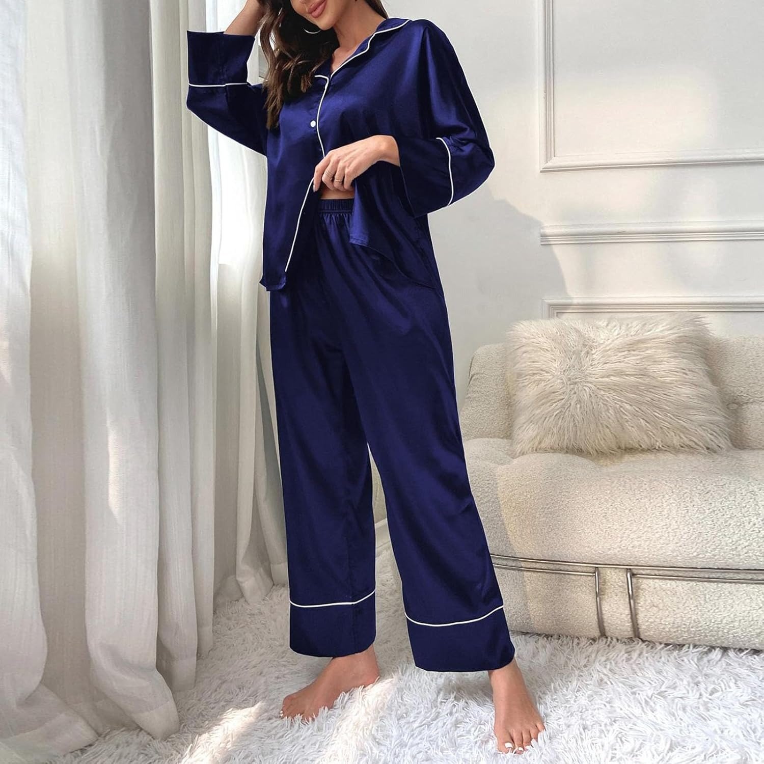 Celebrate comfort and style with this luxurious satin pyjama set for women. Designed with a long-sleeve top and matching pants, it’s perfect for cozy winter nights, holiday mornings, or relaxing weekends at home. Available in multiple colors and plus sizes.